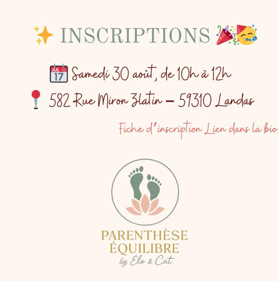 Venez découvrir tout un programme rempli de douceur, de rires et de belles découvertes ! Voir notre article : Association “Parenthèse Équilibre” by Elo & Cat – Inscriptions ouvertes ! – Mairie Landas