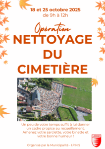 Un peu de votre temps suffit pour (re)donner à notre cimetière un cadre propice au recueillement. Que ce soit pour une demi-heure, une heure, ... Toute participation est bienvenue ! Surtout, n'oubliez pas d'amener votre sarclette, binette, vos gants de jardin et bonne humeur !! Un second créneau est proposé le 25 octobre, aux mêmes…