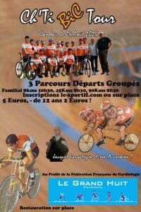 Nous vous attendons nombreux à participer au Ch'Ti Bic Tour, au profit de la Fédération Française de Cardiologie. Trois parcours départs groupés : 8h30 : 90 km - 9h30 : 45 km - 10h30 : 8km (parcours familial). Ambiance assurée par Jacques Vanpetegem et son accordéon.